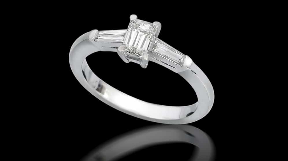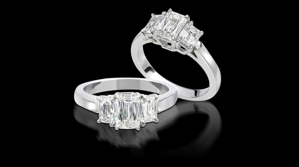טבעות אירוסין מעוצבות משובצות ביהלום בליטוש אמרלד ויהלומים בצדדים