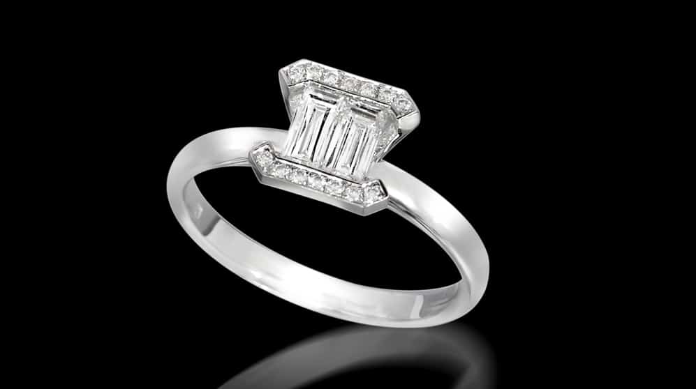 טבעת אירוסין מעוצבת משובצת ביהלום המעניק אשליה של ליטוש פרינסס ויהלומים מסביב