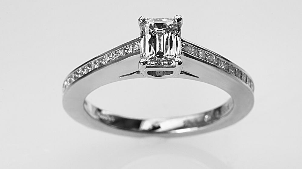 טבעת אירוסין מעוצבת משובצת ביהלום בליטוש אמרלד ויהלומים בצדדים