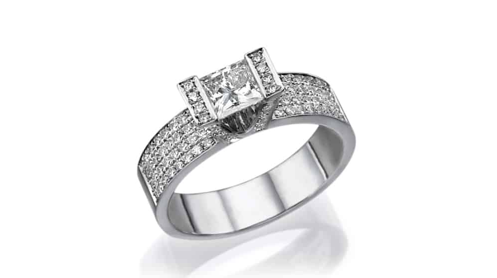 טבעת אירוסין מזהב לבן משובצת ביהלום בליטוש פרינסס ויהלומים קטנים מסביב