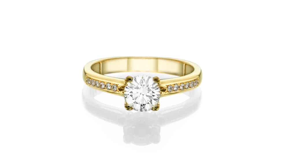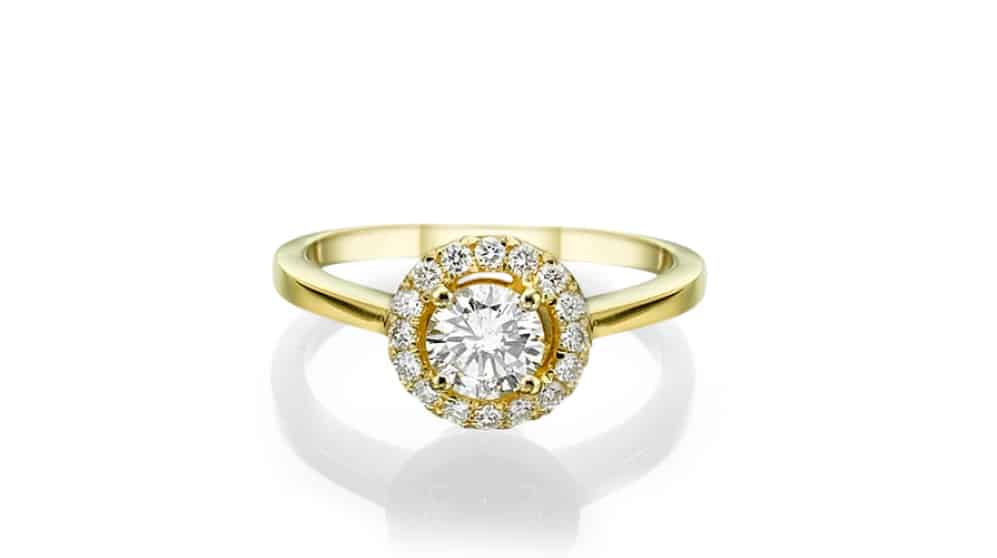 טבעת אירוסין מזהב צהוב משובצת ביהלום בליטוש עגול ויהלומים קטנים מסביב